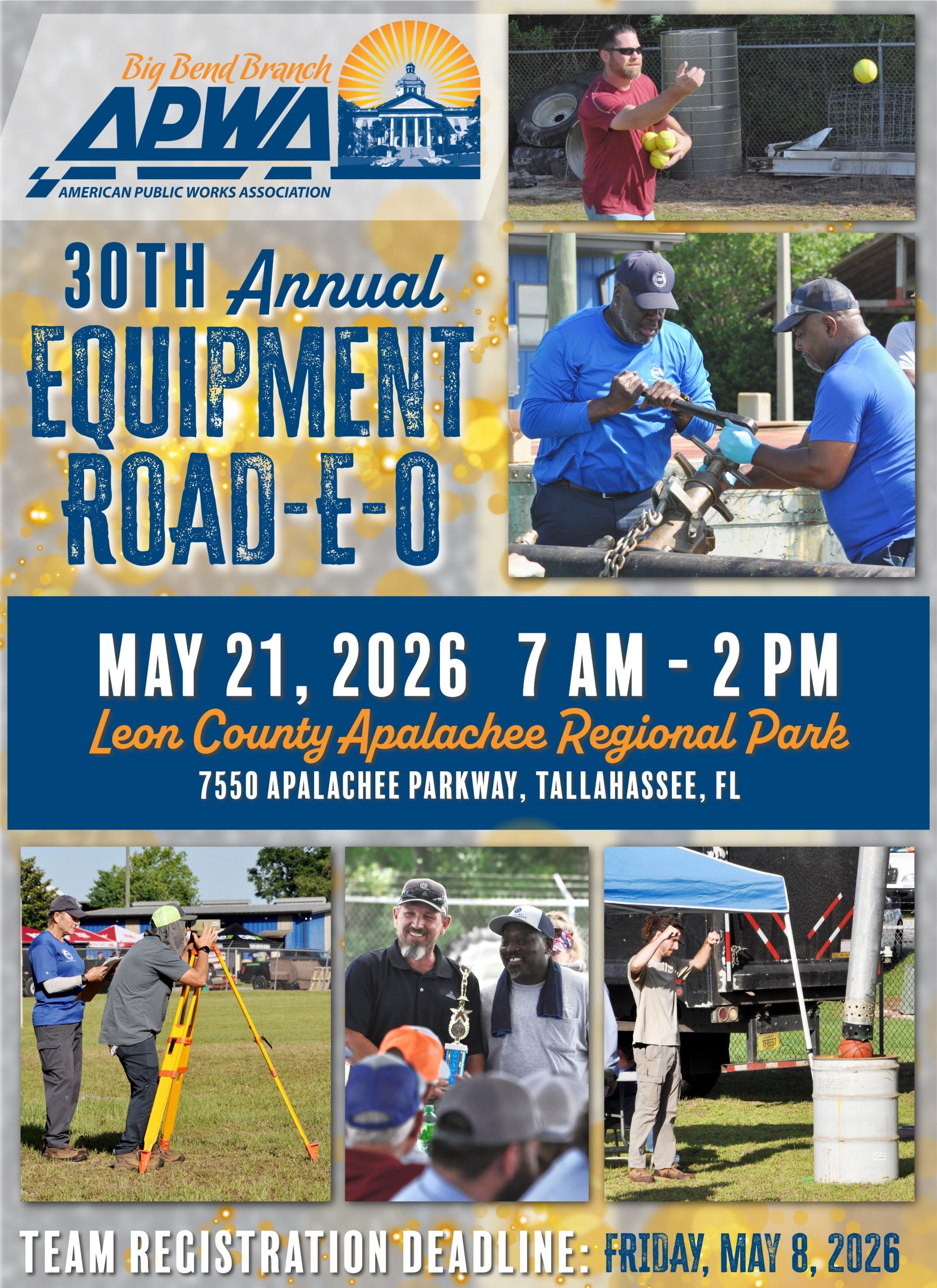 Our upcoming 30th Road-E-O will be held on May 21, 2026, at the Leon County Apalachee Regional Park, during Public Works Week (May 17-23, 2026). The theme this year is “Rooted in Service, Powered by Community”. Please look out for updates via email and notices via this website. We will be looking for volunteers to help with the Road-E-O.